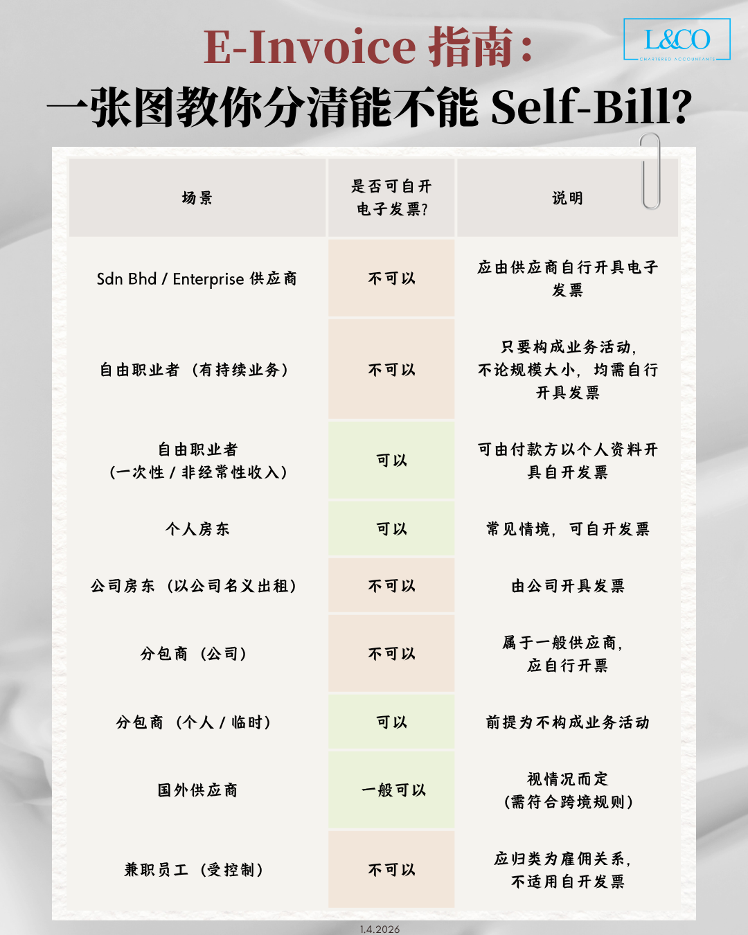 在电子发票(e-Invoice)实施后,许多企业对于是否可以使用 Self-Billing(自开发票)仍存在疑问。 实际上,是否适用取决于供应方的性质与交易背景。 判断是否可以 Self-Bill 的关键在于: 供应方是否在进行商业活动。 不适用 Self-Billing 的情况 当供应方属于以下类别时,应由其自行开具 e-Invoice: 注册公司(Sdn Bhd / Enterprise) 持续提供服务的自由职业者 以公司名义出租的物业 公司分包商 可适用 Self-Billing 的情况 在以下情境中,付款方可使用 Self-Billing: 一次性或非经常性收入的个人 [...]