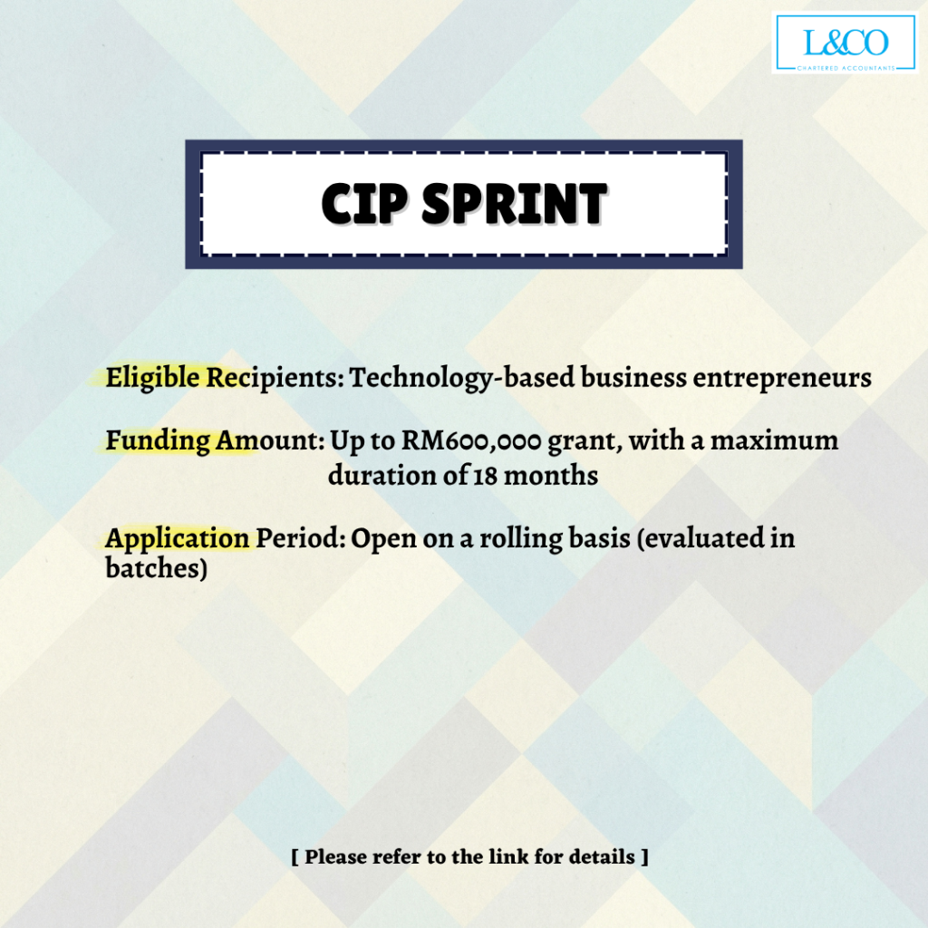 CIP SPRINT is a grant of up to RM600,000 for a maximum period of eighteen (18) months to help entrepreneurs finance their technology-based business ventures.