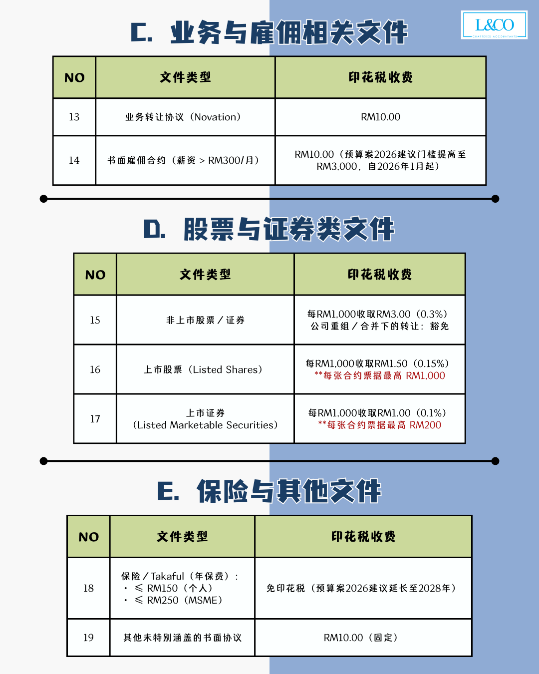 | 14 | 书面雇佣合约(薪资 > RM300/月) | RM10.00(预算案 2026 建议门槛提高至 RM3,000,自 2026 年 1 月起) |
