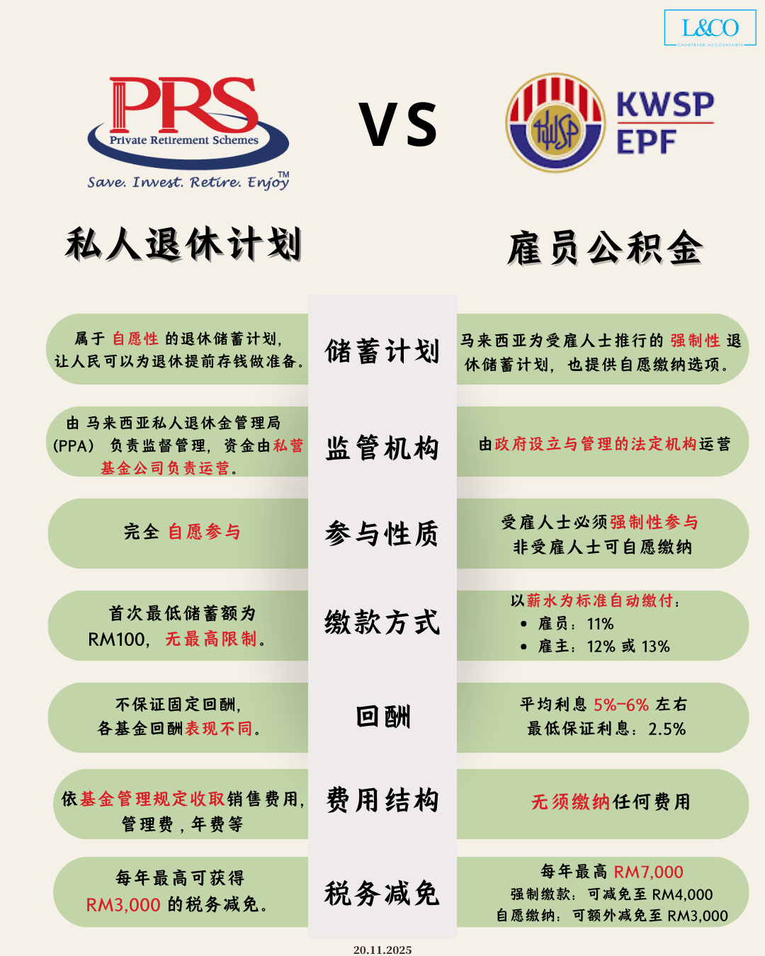 在马来西亚,为退休储蓄的主要工具包括 雇员公积金(EPF) 与 私人退休计划(PRS)。虽然两者的目标都是保障退休生活,但在性质、参与方式、投资回报及税务优惠等方面存在显著差异。以下整理了主要比较内容,供参考: