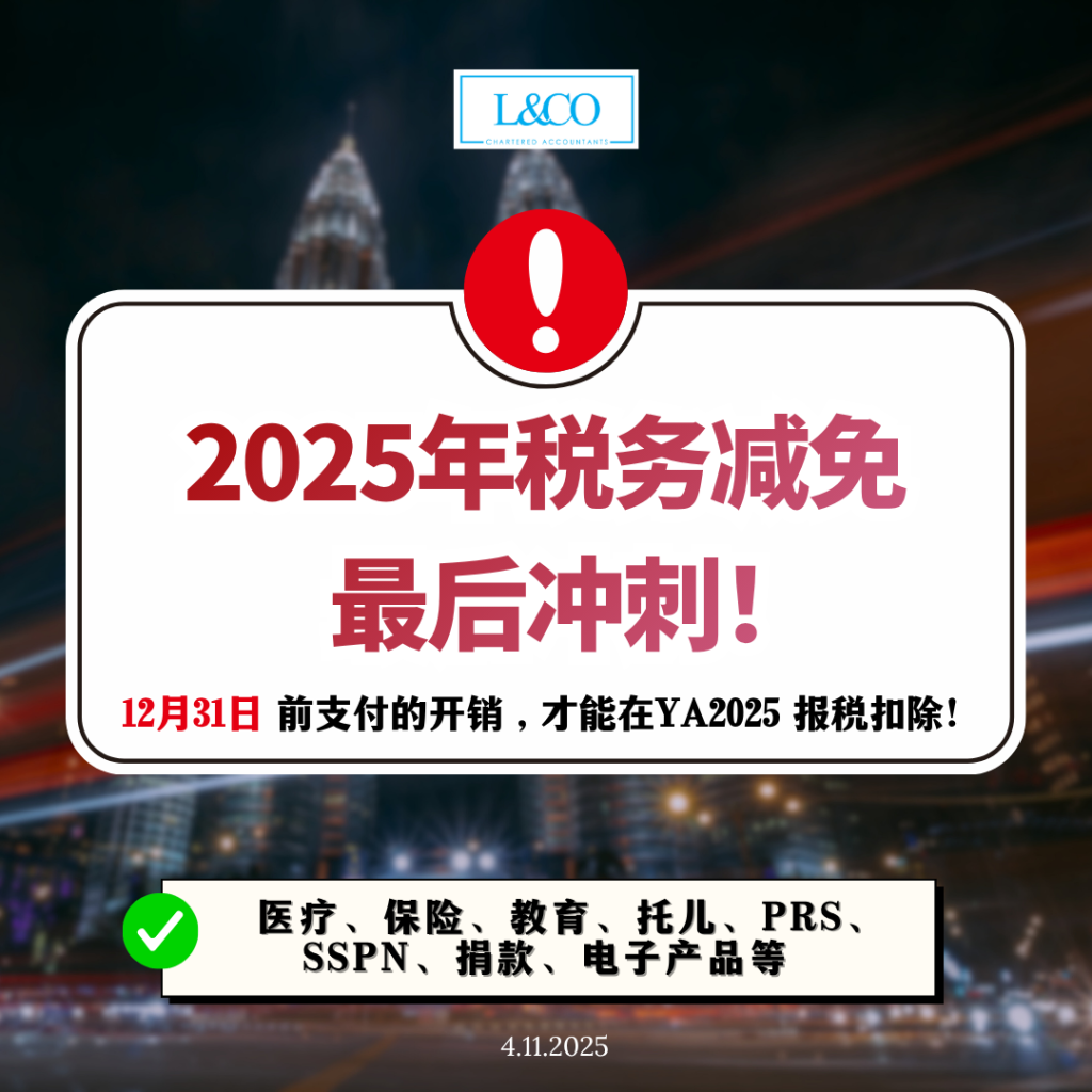 2025 即将结束!现在是检查并善用你的个人税务减免(Tax Relief)的最佳时机! 2025年税务减免最后冲刺 凡在 2025 年 12 月 31 日前支付的合格支出,都可在 2025 课税年度(YA 2025) 的个人所得税申报中扣除。 赶紧看看你是否已充分享用以下项目 常见可抵扣项目: 保险与法定交款(EPF + Life Insurance 限额 RM7,00) 医疗与体检费用(包括父母医疗,限额 RM10,000) [...]