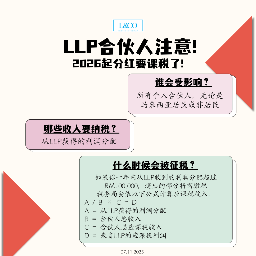 从2026课税年度开始,你从LLP拿到的利润分配(Profit Distribution)将不再“免税”! 谁会受影响? 所有个人合伙人,无论是马来西亚居民或非居民 哪些收入要纳税? 从LLP获得的利润分配(Profit Distribution) 什么时候会被征税? 如果你一年内从LLP收到的利润分配超过RM100,000,超出的部分将需缴税 税务局会依以下公式计算应课税收入: A / B × C = D A = 从LLP获得的利润分配 B = 合伙人总收入 C = [...]
