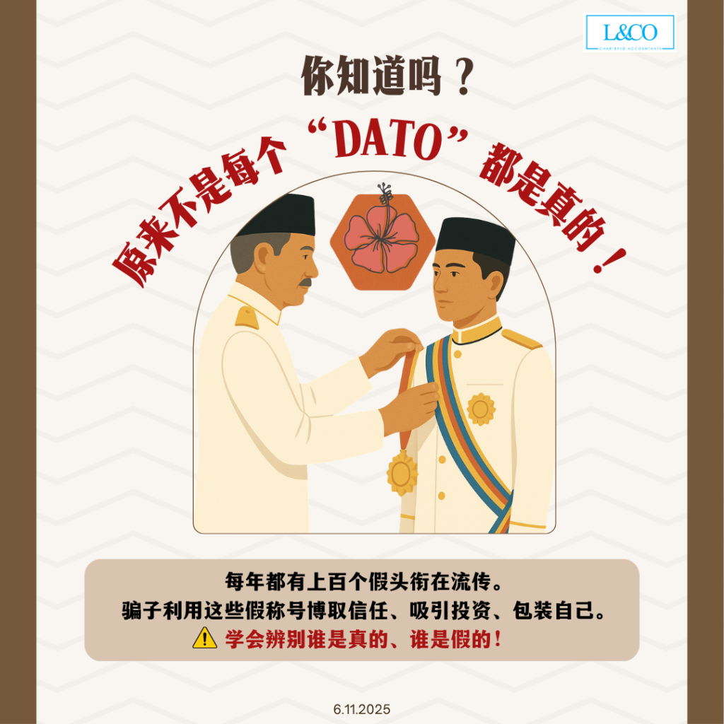 在马来西亚,拥有 “Dato” 或 “Datuk” 头衔代表着国家或州属对个人贡献的最高荣誉。 然而,近年来出现越来越多冒用、伪造或非法使用头衔的案例,公众有必要了解真伪辨别方式,以防受骗。 Dato / Datuk 的真正来源 “Datuk” 为国家元首所颁发的联邦勋衔, “Dato” 则由各州苏丹或元首授予。 获封者通常因在国家、社会或经济领域有显著贡献。 真正的头衔持有人必须具备: 官方颁授证书(Surat Watikah) 正式授勋仪式记录 登记于国家或州级荣誉名录中 假头衔带来的风险 假头衔持有人往往利用社会信任: 从事投资诈骗、非法集资 谎称政治或皇室关系 以头衔名义招揽合作或募款 [...]