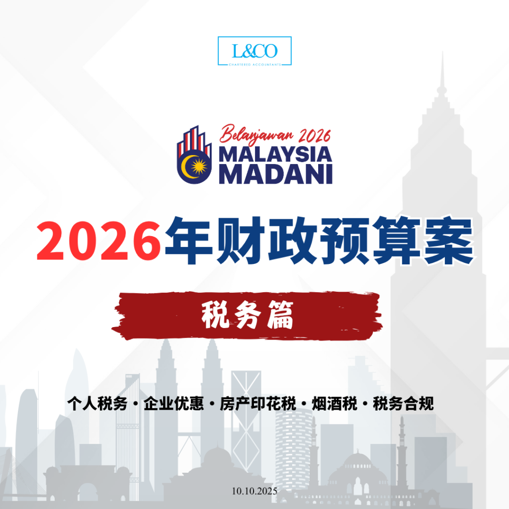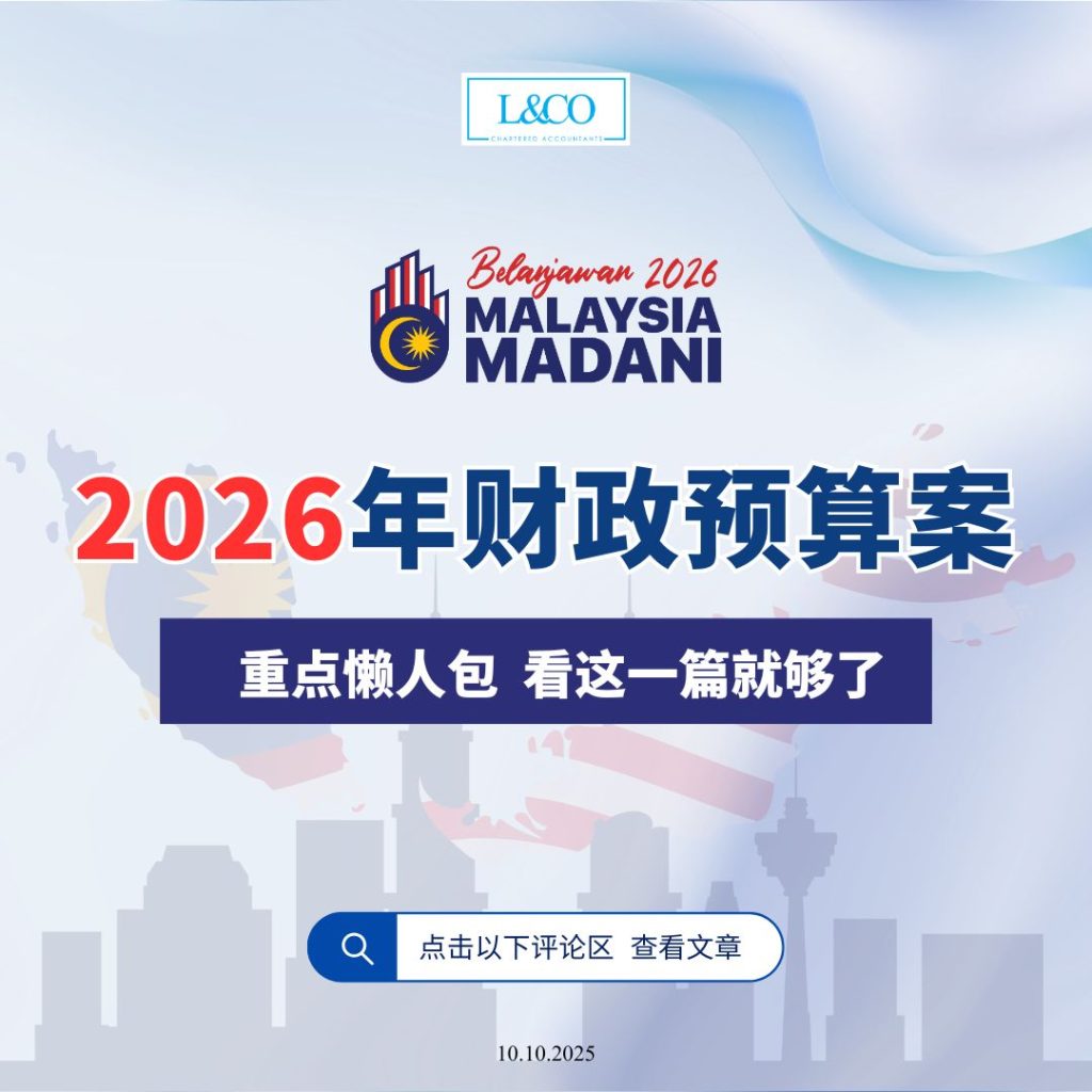 马来西亚财政预算案 2026:稳中求进,聚焦改革与人民福利 随着2026年财政预算案正式公布,政府在全球经济动荡与地缘政治不确定性中,依然秉持“昌明经济”框架,致力于在稳定经济、提升民生及深化改革之间取得平衡。 这份预算案不仅是数字的分配,更体现了国家在“后常规时代”中重塑经济韧性、确保包容性增长的决心。 预算案的核心目的 2026财政预算案的核心目标在于: 推动结构性改革,减少对传统产业的依赖; 保障人民生活质量,确保增长成果由全民共享; 稳健财政管理,在扩大发展支出的同时,维持可持续的赤字水平; 强化投资信心,吸引国内外资本流入新兴领域如半导体、AI与清真经济。 尽管外部环境仍充满挑战,但政府预计2026年我国GDP将保持在 4%至4.5% 之间,财政赤字目标则缩减至 3.5%,显示大马正逐步迈向更健康、更具韧性的财政结构。 作为一家会计楼,我们建议企业和个人密切关注未来的政策动态,合理规划税务和财务策略,以应对可能的变化与挑战。 财政预算案2026 重点速览 国家财政与政府债务 总拨款:4192亿令吉(比2025年增加71亿) 财政赤字:3.5% 发展开销:810亿令吉,行政开销:3382亿 预算总收入:3431亿令吉 GDP增长预测:4–4.5%(略低于2025年) 经济与投资 柔新经济特区投资371亿,占柔佛总投资66%,新增投资承诺290亿 [...]
