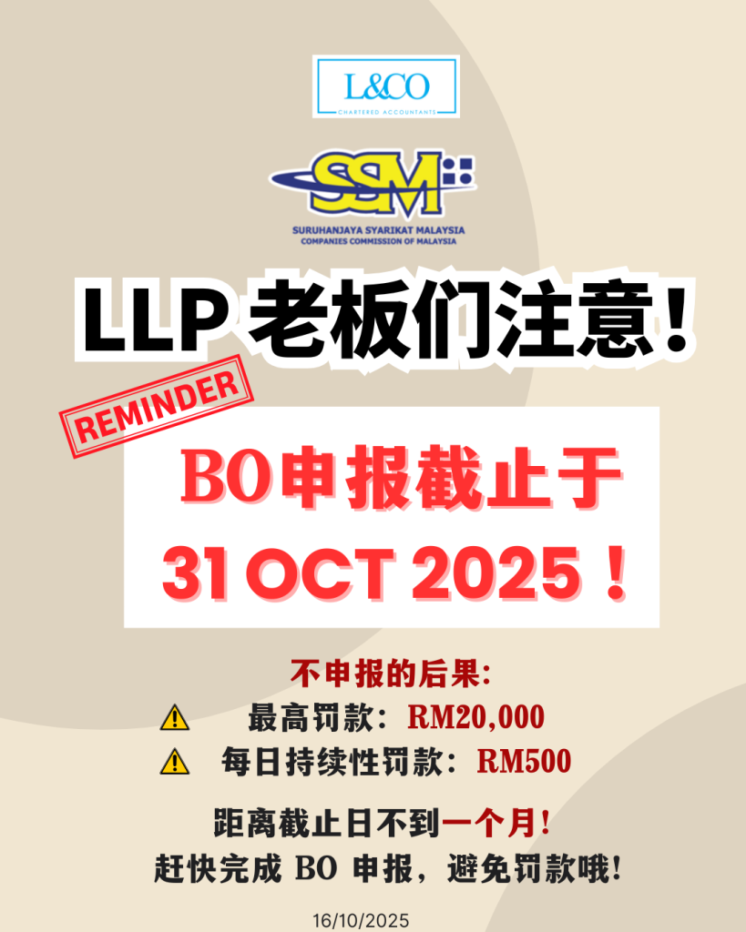马来西亚公司委员会(SSM)已自 2025年1月31日 起,正式落实所有 有限责任合伙企业(LLP/PLT) 必须确认并申报其实益拥有人(BO)资料的规定。 为协助企业顺利过渡,SSM 给予 五个月的宽限期,从 2025年5月30日 至 2025年10月31日。在此期间完成申报,可避免罚款。 什么是实益拥有人?(Beneficial Ownership,简称 BO) :实益拥有人是指最终控制或享有 LLP 实际收益的自然人,即真正拥有决策权、资产或利润分配权的人。 关键日期与要求 宽限期: 2025年5月30日 – 2025年10月31日 正式执行: 2025年11月1日起 -从11月起,企业在记录 [...]