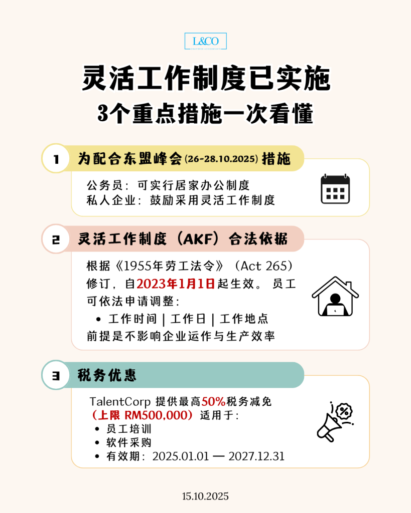 马来西亚正式落实「灵活工作制度(AKF)」!无论是公务员还是私人企业,都可实行居家办公、弹性工时与灵活工作地点 想知道如何合法申请与享受税务优惠?立即了解详情,让你的企业更灵活、更高效! 为配合东盟峰会措施 公务员:可实行居家办公制度 私人企业:鼓励采用灵活工作制度 法律依据 根据《1955年劳工法令》(Act 265)修订,自 2023年1月1日 起生效 员工可依法申请调整: 工作时间 工作日 工作地点 税务优惠 TalentCorp 提供 最高50%税务减免(上限 RM500,000)适用于: 员工培训 软件采购 有效期:2025.01.01 — 2027.12.31 **资料更新至17.10.2025
