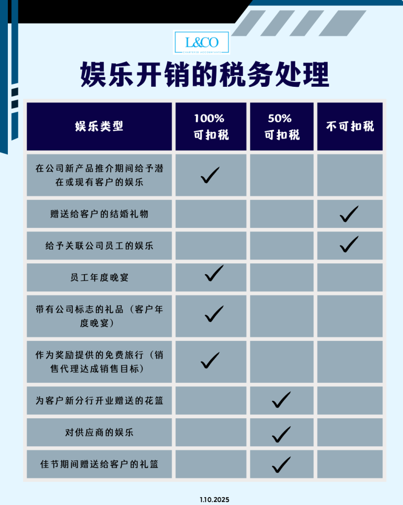 根据《所得税法 1967》第39(1)(l) 条及 LHDN Public Ruling No. 3/2008 与 4/2015: -并非所有娱乐开销都能扣除。 -一般娱乐开销只允许 50% 扣税。 -仅限于法令中明确列出的特定项目,才可享有 100% 扣税。 -与业务无关或属于私人性质的支出,一律 不可扣税。 娱乐开销的税务处理: 1. 在公司新产品推介期间给予潜在或现有客户的娱乐 → 100% 可扣税 [...]