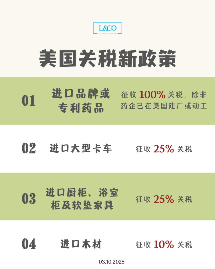 为推动美国本土产业发展,美国宣布对多类进口商品加征关税: 品牌或专利药品:征收 100% 关税,仅限在美设厂或动工的企业可获豁免 大型卡车:关税上调至 25% 厨柜、浴室柜及软垫家具:统一加征 25% 木材:加征 10% **资料更新于 03.10.2025