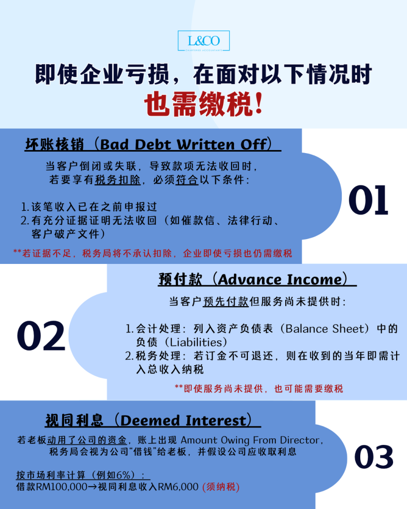 企业亏损≠免税! 即使公司面临亏损,下列情形仍可能被征税 1. 坏账核销(Bad Debt Written Off) 当客户倒闭或失联,导致款项无法收回时,若要享有税务扣除,必须符合以下条件: 该笔收入已在之前申报过 有充分证据证明无法收回(如催款信、法律行动、客户破产文件) **若证据不足,税务局将不承认扣除,企业即使亏损也仍需缴税。 2. 预付款(Advance Income) 当客户预先付款但服务尚未提供时: 会计处理:列入资产负债表(Balance Sheet)中的负债(Liabilities) 税务处理:若订金不可退还,则在收到的当年即需计入总收入纳税。 **即使服务尚未提供,也可能需要缴税。 3. 视同利息(Deemed Interest) 若老板动用了公司的资金,账上出现 Amount Owing [...]
