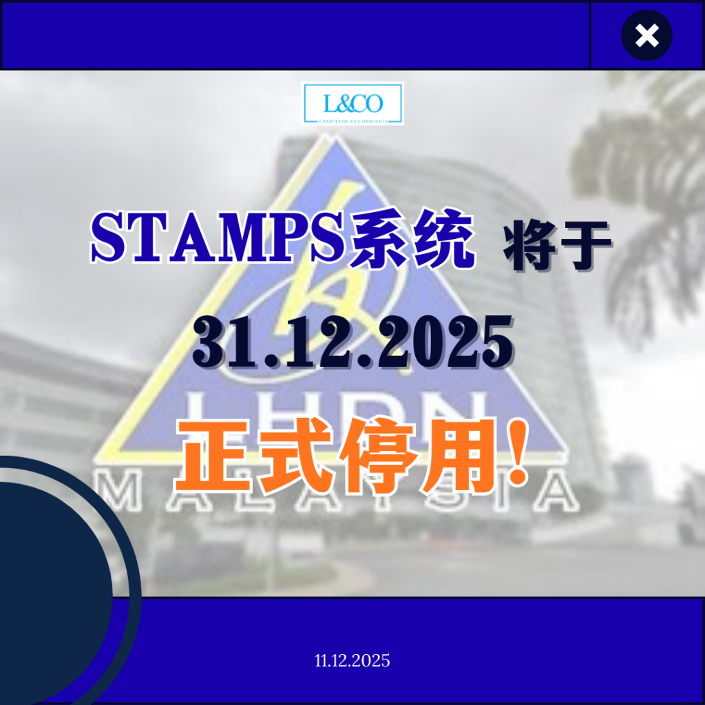 STAMPS系统将于2025年12月31日停用。2026年起所有印花税需通过MyTax门户办理。 你现在需要做什么? 情況 1:你已经有 MyTax 帐号 登录 MyTax 进入 ezHASiL 选择 印花税(e-Duti Setem) 情況 2:你还没有 MyTax 帐号 已有 TIN:请务必在 12 月 31 日前 完成 MyTax [...]