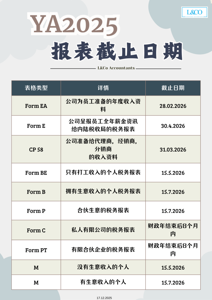 以下为 YA 2025(2026 年申报) 各类税务表格的截止日期,涵盖个人、雇主及企业。请根据自身情况,留意相应的申报时间,避免逾期罚款。 1. 雇主申报 Form EA 员工年度收入资料,由雇主提供给员工 截止日期:28 February 2026 Form E 雇主向 LHDN 申报员工全年薪资与福利资料 截止日期:30 April 2026 CP 58 代理人、经销商及分销商的收入申报 截止日期:31 [...]