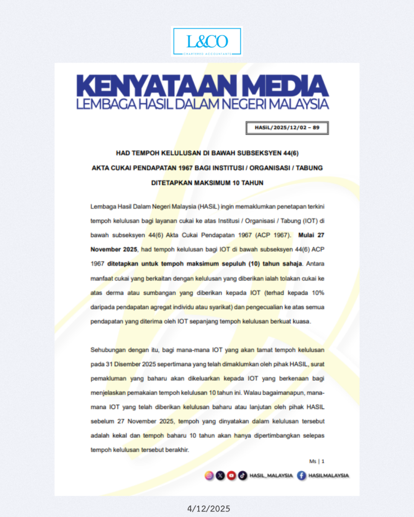 旧规:批准期限按机构情况核定,无统一上限。 新规(自 2025 年 11 月 27 日生效):所有依据《1967 年所得税法案》44(6) 条所获批的机构/组织/基金(IOT),免税资格核准期限将 限定为最多 10 年。 这一政策适用于: 慈善组织 福利机构 宗教机构 教育基金 社区服务类非政府组织 其他可接受可扣税捐款的 IOT 若机构的现有豁免期限将在 2025 年 12 [...]