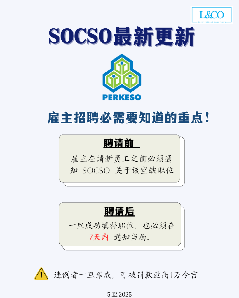 根据《Employment Insurance System (Amendment) Bill 2025》,雇主将承担新的申报义务: 1. 聘请员工前(Before Hiring) 雇主必须在招聘新员工前,以书面形式通知 SOCSO 有关职位空缺。 2. 聘请员工后(After Hiring) 职位一旦成功填补,雇主需在 7 天内 通知 SOCSO。 3. 违规后果(Penalty) 若雇主未遵守以上规定,可被判罚款 不超过 RM10,000。 [...]