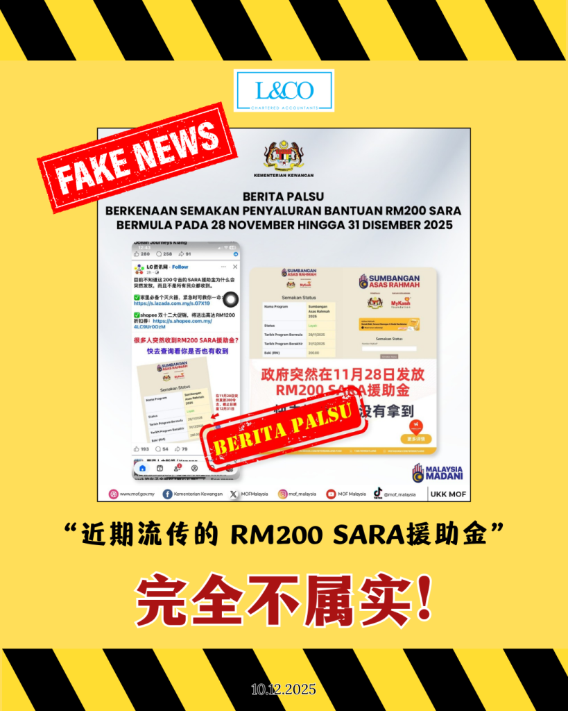 马来西亚财政部已正式澄清: 近期流传流传的“11月28日发放 RM200 SARA 援助金”完全不属实,是虚假信息! 所有声称可即时查询、领取援助金的网站链接皆为假冒页面。 请勿点击可疑链接、填写个人资料或提供银行信息。 官方援助资讯只通过官方渠道发布: Kementerian Kewangan Malaysia MOF Malaysia 官方网站与社交媒体 **资料更新于10.12.2025