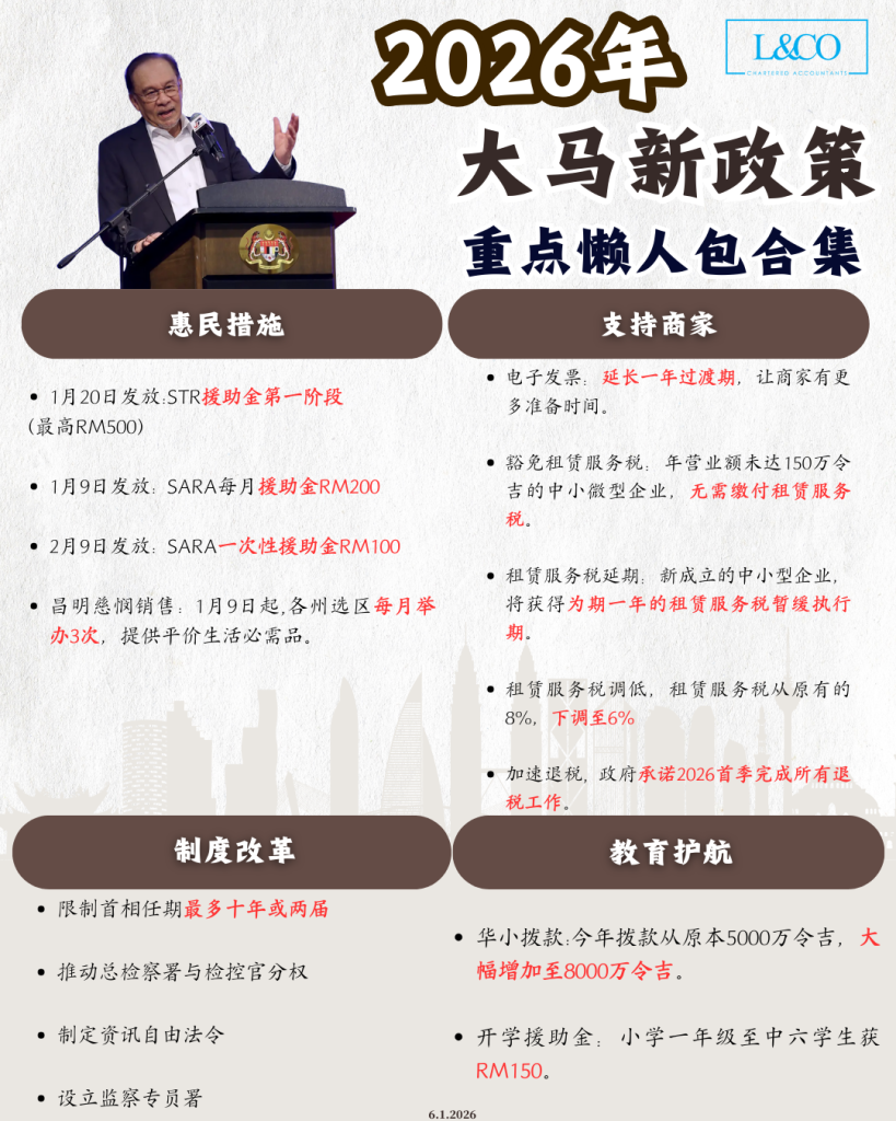 为推动经济稳健发展、提升人民福祉,并强化国家治理体系,政府于 2026 年推出多项涵盖惠民措施、制度改革、商家支持及教育发展的新政策。本页面汇总 2026 年大马重点政策内容,协助公众快速了解相关措施与实施方向。 1. 惠民措施 STR 援助金(第一阶段)STR 第一阶段援助金将于 1 月 20 日 发放,合资格者最高可获 RM500。 SARA 每月援助金符合资格者自 1 月 9 日 起,每月可获得 RM200 援助金。 [...]