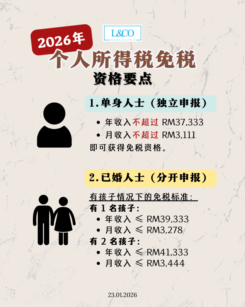 根据 马来西亚内陆税收局(LHDN) 发布的资料,年度收入低于一定门槛的纳税人 可免缴个人所得税(以下数据已考虑标准免税额与抚养扣除等因素) 可免税条件速览 1. 单身人士(独立申报) 年收入 不超过 RM37,333 月收入 不超过 RM3,111 2. 已婚人士(分开申报) 有孩子情况下的免税标准: 有 1 名孩子: 年收入 ≤ RM39,333 月收入 ≤ RM3,278 [...]