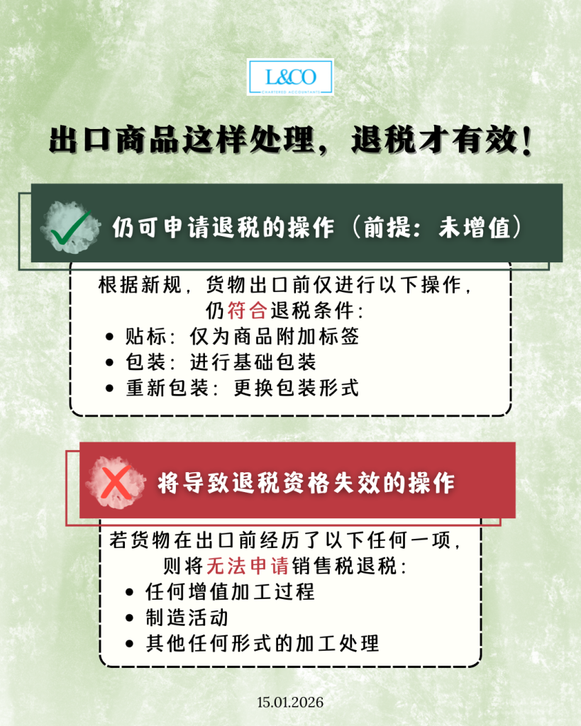 马来西亚皇家海关总署(JKDM)正式发布 2026 年第 1 号通用裁决,为出口商品的 销售与服务税(SST)退税申请 提供了更明确、可执行的标准。自 2026 年 1 月 5 日起生效,出口企业务必留意! 仍可申请退税的操作(前提:未增值) 根据新规,货物出口前仅进行以下操作,仍符合退税条件: 贴标:仅为商品附加标签 包装:进行基础包装 重新包装:更换包装形式 将导致退税资格失效的操作 若货物在出口前经历了以下任何一项,则将无法申请销售税退税: 任何增值加工过程 制造活动 其他任何形式的加工处理 **资料更新于27.01.2026