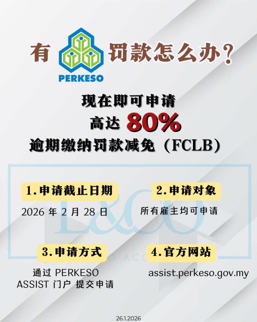 如贵公司目前存在 PERKESO 逾期缴纳附加利息(FCLB), 现可把握机会申请 高达 80% 的罚款减免,以协助雇主更新缴费记录并减轻财务负担。 申请对象 符合资格的所有雇主 减免内容 高达 80% 的逾期缴纳附加利息(FCLB) 申请期限 即日起至 2026 年 2 月 28 日 申请方式 雇主可通过 PERKESO ASSIST [...]