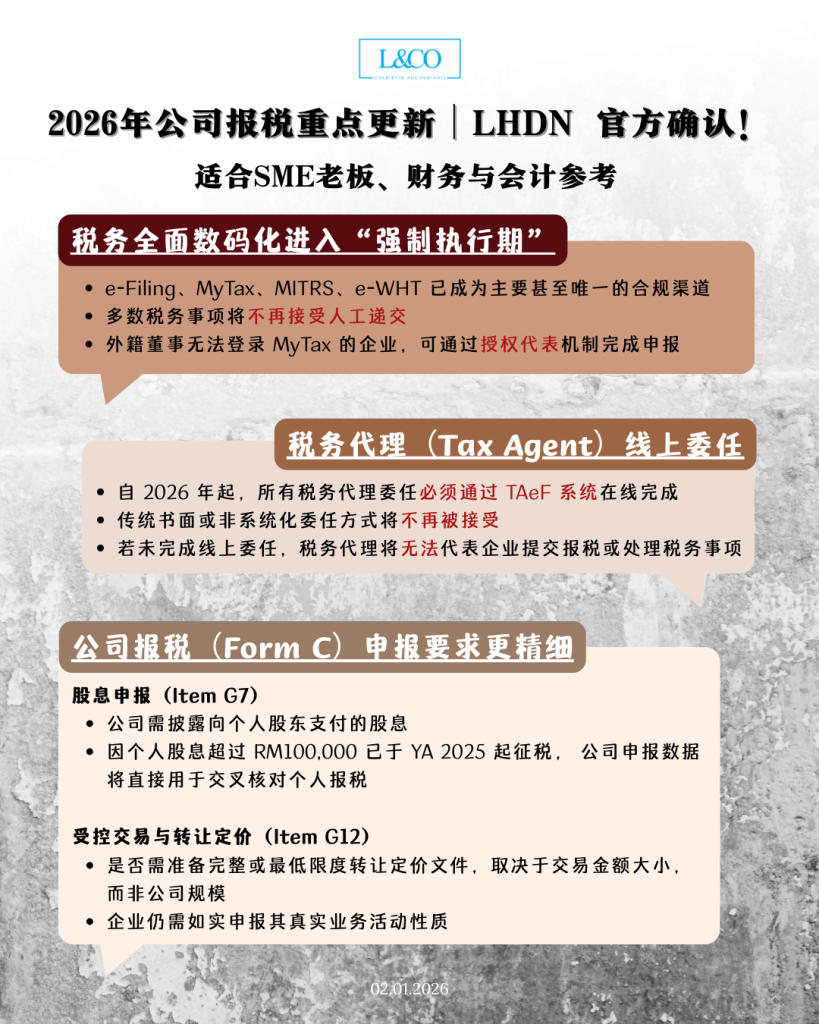 将于 2026 年对企业税务申报、合规流程及风险管理产生直接影响的关键监管变化。及早了解并提前部署,是避免罚款、延误及营运中断的关键。 核心重点速览 一、税务全面数码化进入“强制执行期” e-Filing、MyTax、MITRS、e-WHT 已成为主要甚至唯一的合规渠道 多数税务事项将不再接受人工递交 外籍董事无法登录 MyTax 的企业,可通过授权代表机制完成申报 二、税务代理(Tax Agent)线上委任 自 2026 年起,所有税务代理委任必须通过 TAeF 系统在线完成 传统书面或非系统化委任方式将不再被接受 若未完成线上委任,税务代理将无法代表企业提交报税或处理税务事项 三、公司报税(Form C)申报要求更精细 股息申报(Item G7) 公司需披露向个人股东支付的股息 [...]