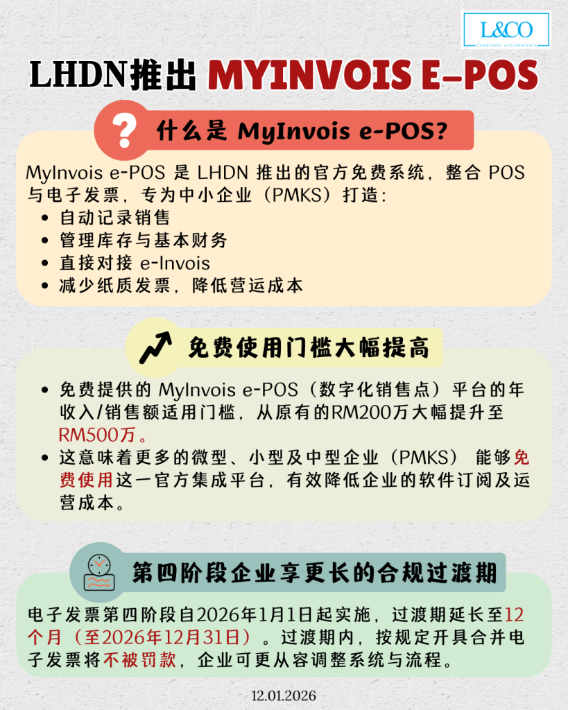 助力中小企业加速数码化转型,LHDN 推出官方 MyInvois e-POS 平台,在确保电子发票合规的同时,协助企业以更低成本实现销售、库存与财务管理的一体化运营。 核心重点速览 什么是 MyInvois e-POS? MyInvois e-POS 是 LHDN 推出的官方免费系统,整合 POS 与电子发票,专为中小企业(PMKS)打造: 自动记录销售 管理库存与基本财务 直接对接 e-Invois 减少纸质发票,降低营运成本 免费使用门槛大幅提高 免费提供的 MyInvois e-POS(数字化销售点)平台的年收入/销售额适用门槛,从原有的 [...]