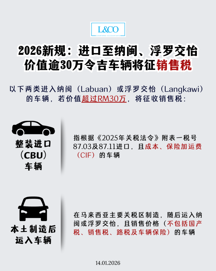 自 2026 年起,凡进入 纳闽(Labuan) 或 浮罗交怡(Langkawi),车辆价值超过 RM300,000,将需缴纳销售税! 核心重点速览 以下两类进入纳闽(Labuan)或浮罗交怡(Langkawi) 的车辆,若价值超过 30万令吉,将征收销售税: 1. 整装进口(CBU)车辆 指根据《2025年关税法令》附表一税号87.03及87.11进口,且成本、保险加运费(CIF)价值超过30万令吉的车辆 2. 本土制造后运入车辆 指在马来西亚主要关税区制造,随后运入纳闽或浮罗交怡,且销售价格(不包括国产税、销售税、路税及车辆保险)超过30万令吉的车辆 **资料更新于15.01.2026