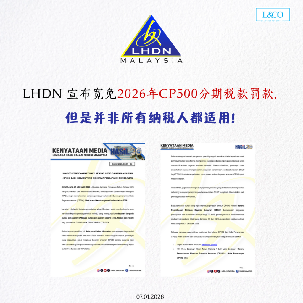 马来西亚内陆税收局(LHDN)近日宣布,针对 2026 课税年(YA 2026)CP500 分期税款,将实施 罚款宽免措施。 惟有关宽免的适用情况,将依据纳税人的收入结构而有所不同。 一、仅有薪资收入的纳税人 凡 仅领取薪资收入 的个人,无需遵守 CP500 分期税款制度。 纳税人仅需: 确保 2025 课税年(YA 2025)报税资料申报准确无误;以及依法完成报税程序,以避免日后产生 补税评估或解释通知。 二、薪资收入兼有其他收入来源的纳税人 此类别包括除薪资收入外,另有 租金收入、利息收入、自由职业收入、佣金或其他收入 的个人。 相关安排如下: 2026 [...]