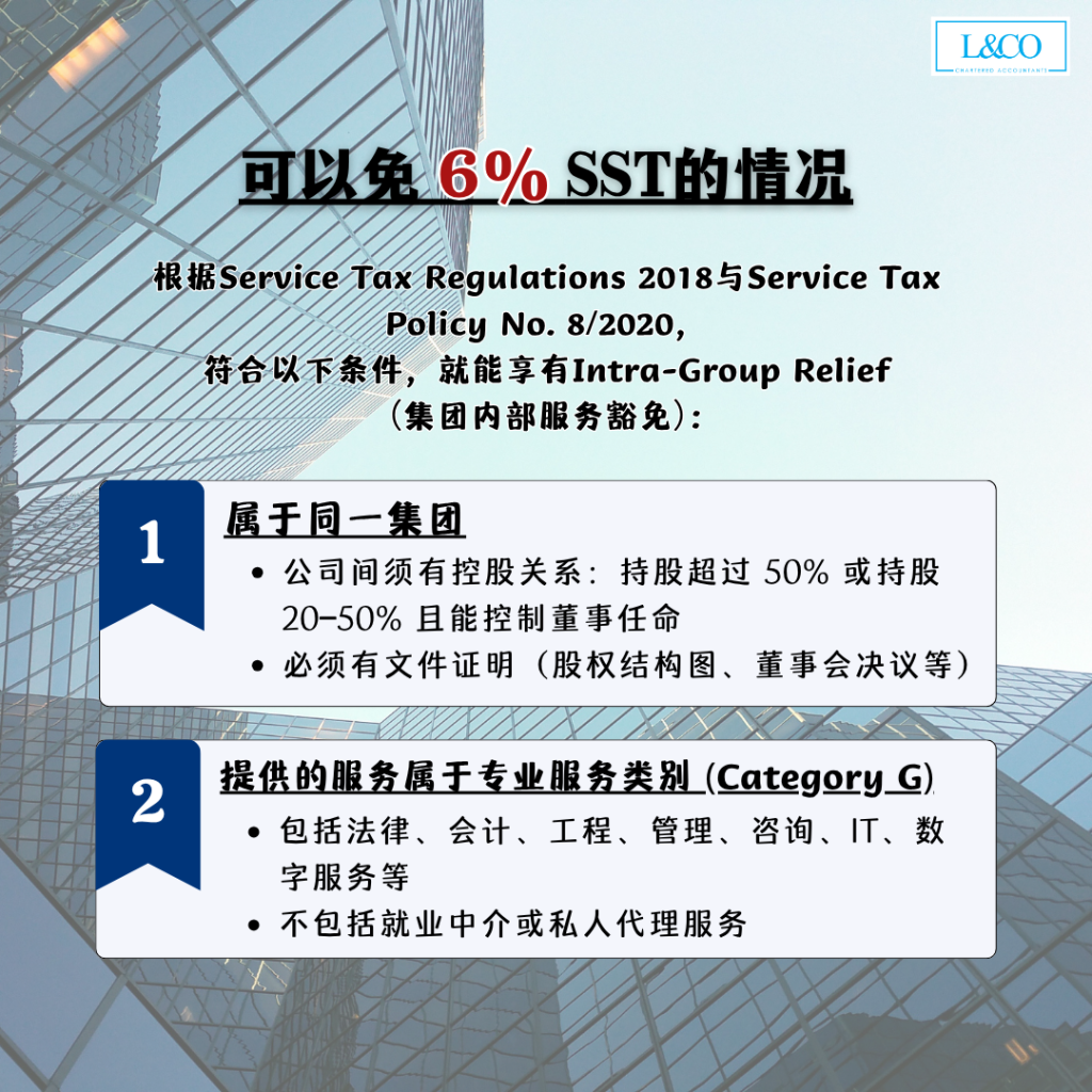 根据 Service Tax Regulations 2018 与 Service Tax Policy No. 8/2020,符合以下条件,就能享有 Intra-Group Relief(集团内部服务豁免):