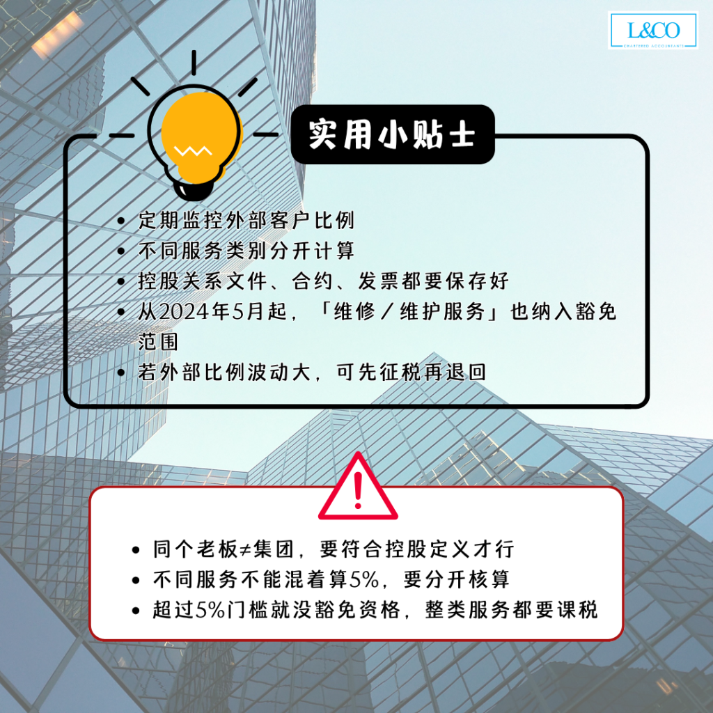 - 若同类服务也提供给集团外客户,只要外部部分 ≤ 5%,仍可享豁免