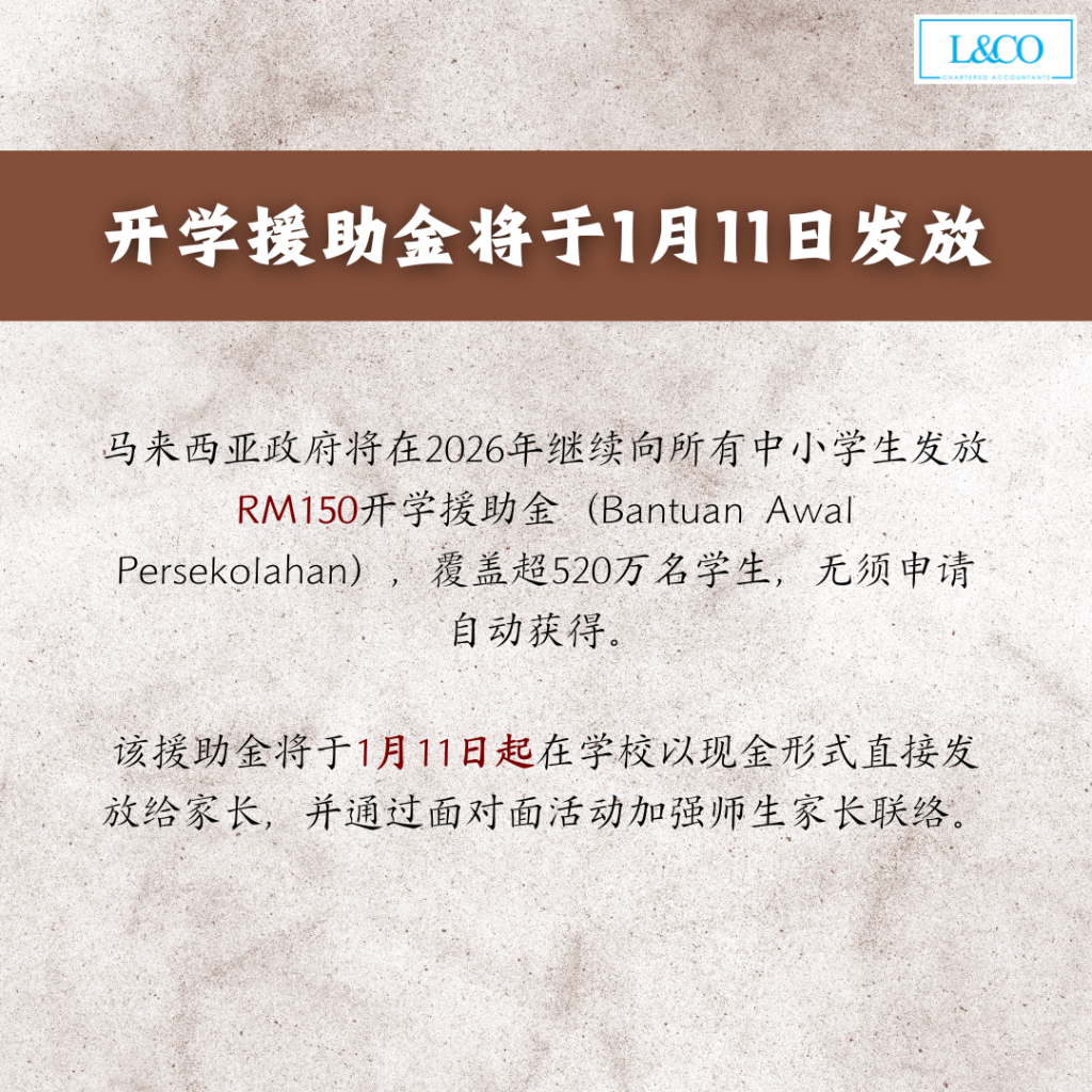 • 马来西亚政府将在 2026 年继续向所有中小学生发放 RM150 开学援助金(Bantuan Awal Persekolahan),覆盖超 520 万名学生,无须申请自动获得