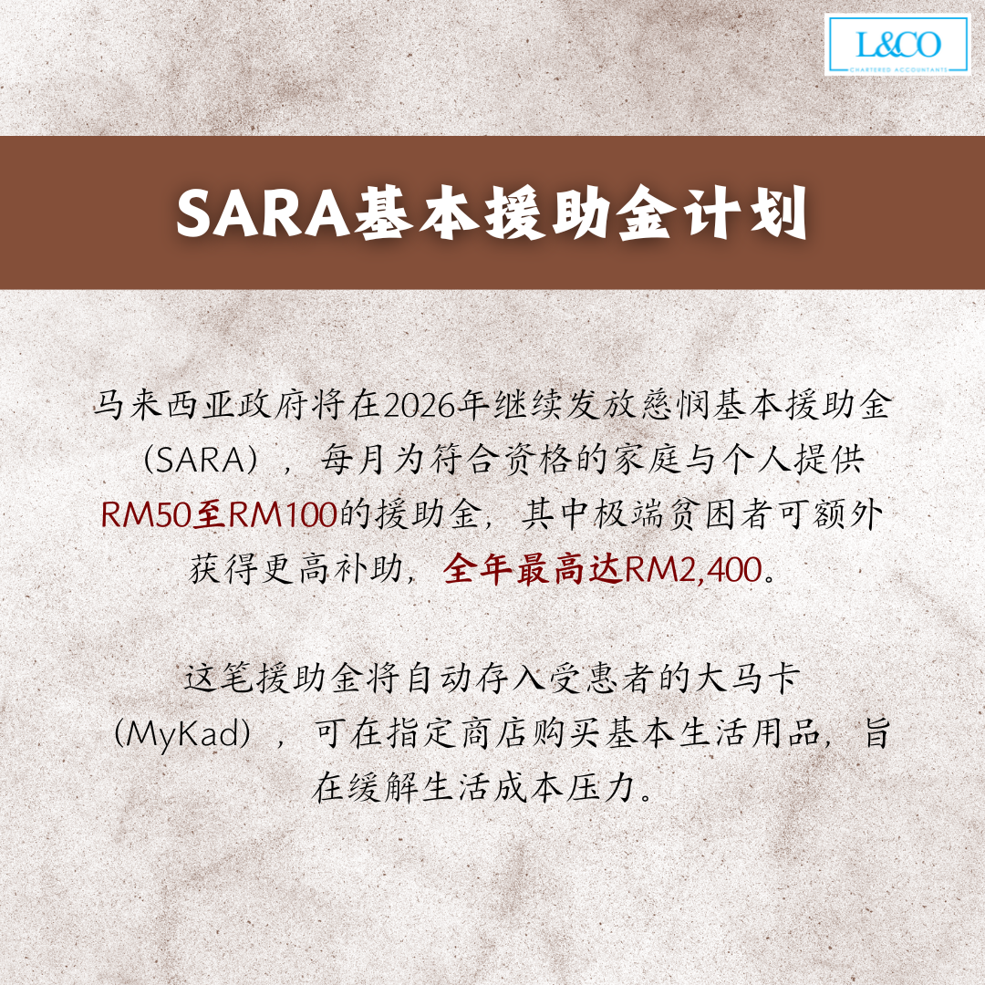 • 马来西亚政府将在 2026 年继续发放慈悯基本援助金(SARA),每月为符合资格的家庭与个人提供 RM50 至 RM100 的援助金,其中极端贫困者可额外获得更高补助,全年最高达 RM2,400