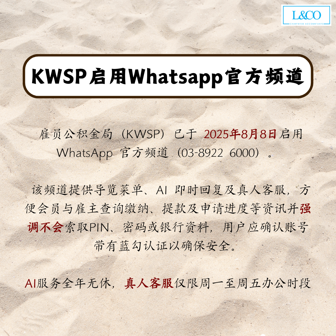 • 雇员公积金局(KWSP)已于 2025年8月8日启用 WhatsApp 官方频道(03-8922 6000)