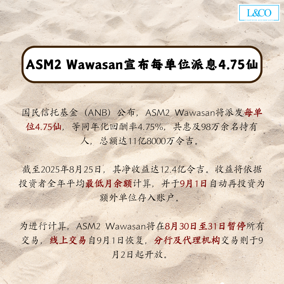 •  国民信托基金(ANB)公布,ASM 2 Wawasan将派发每单位4.75仙,等同年化回酬率4.75%,共惠及98万余名持有人,总额达11亿8000万令吉