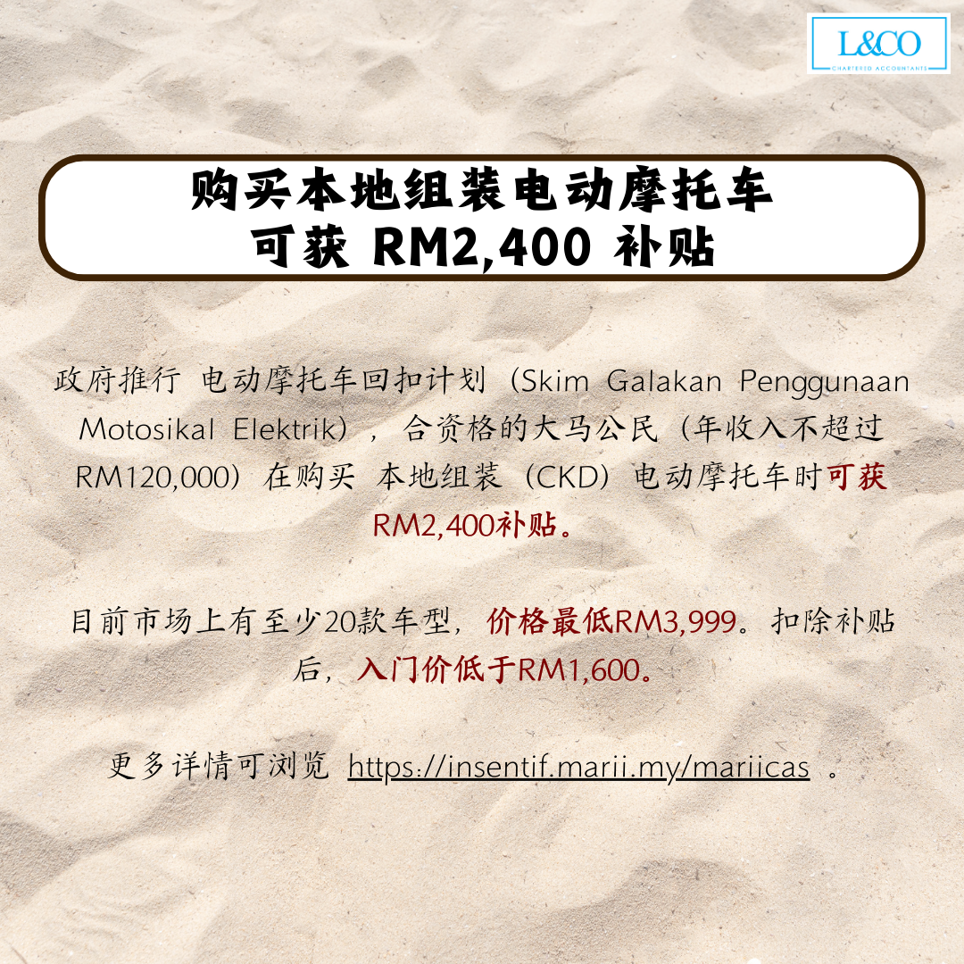 • 政府推行 电动摩托车回扣计划(Skim Galakan Penggunaan Motosikal Elektrik),合资格的大马公民(年收入不超过 RM120,000)在购买 本地组装(CKD)电动摩托车 时可获 RM2,400 补贴