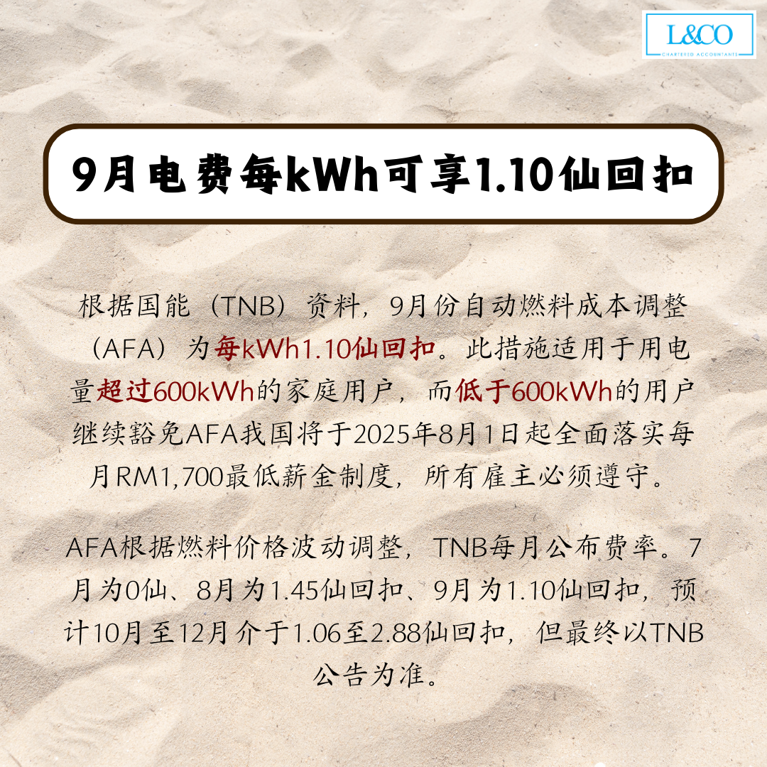 • AFA 根据燃料价格波动调整,TNB 每月公布费率。7月为0仙、8月为1.45仙回扣、9月为1.10仙回扣,预计10月至12月介于1.06至2.88仙回扣,但最终以TNB公告为准