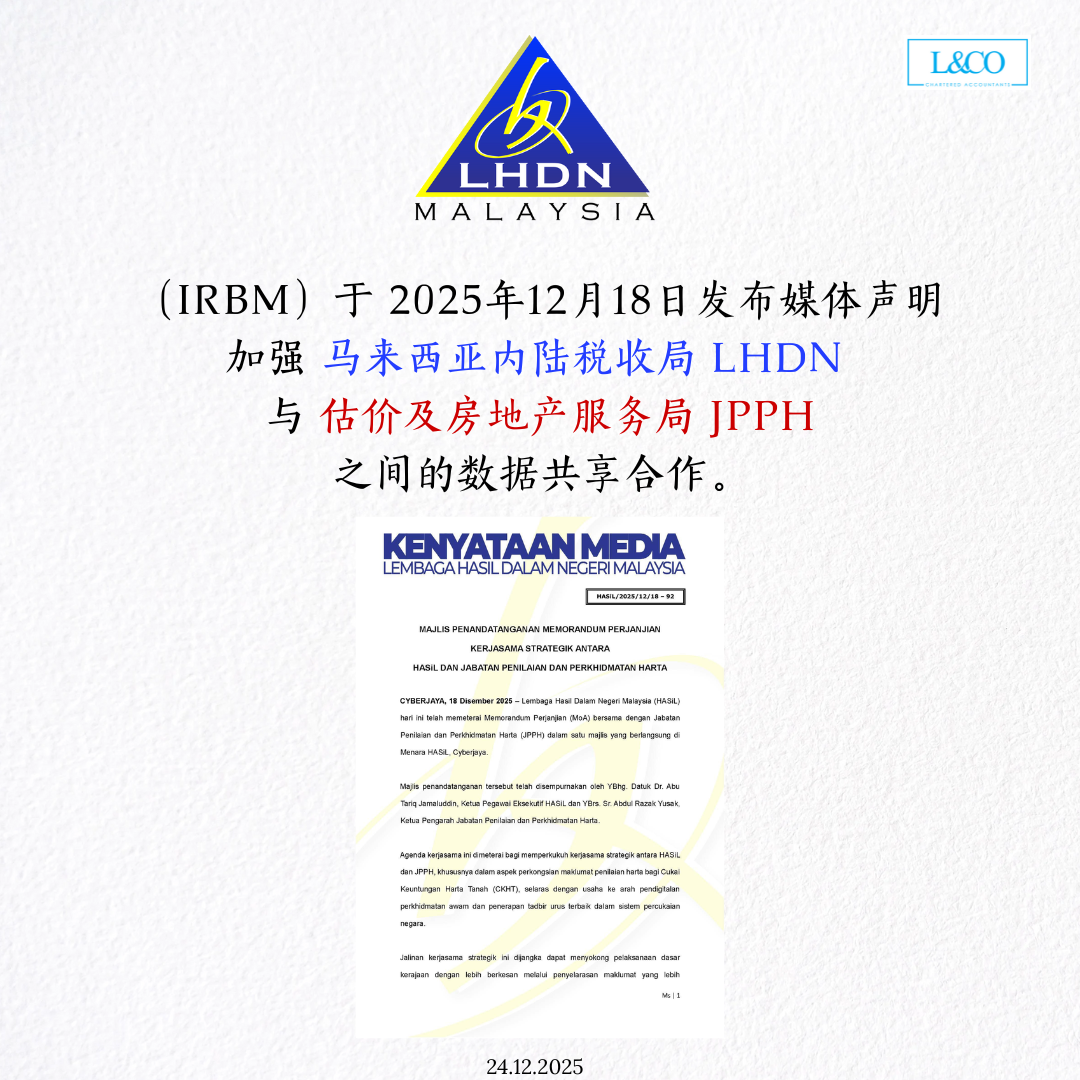2025 年 12 月 18 日,马来西亚内陆税收局(LHDN)与估价与房地产服务局(JPPH)签署战略合作备忘录(MoA),双方将共享房地产估值数据,以提升房地产税务评估的透明度与准确性