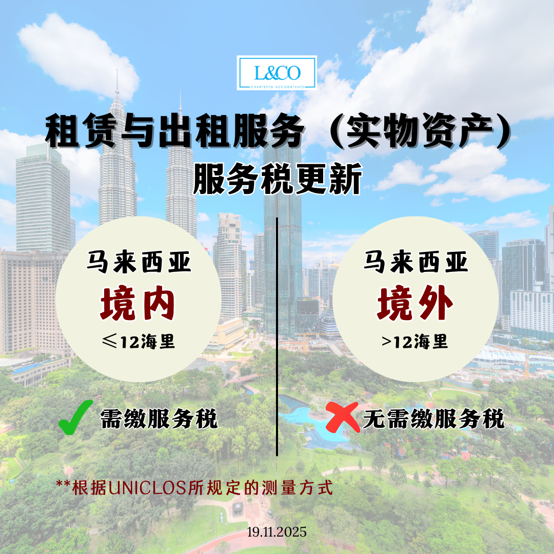 Information sharing 租赁与出租服务税最新更新! Posted November 21, 2025 LnCoadmin 你的资产租出去要不要缴服务税? 现在只看 一个条件:资产位在境内还是境外! 境内(≤12海里) → 须缴 6% 服务税 境外(>12海里) → 无需缴服务税 **资料更新于21.11.2025