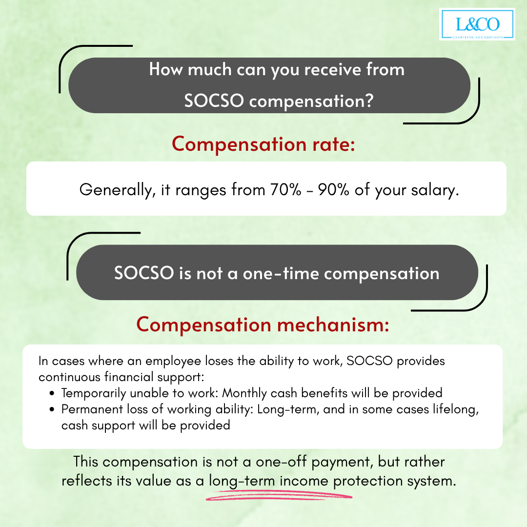 SOCSO compensation typically ranges between: 70% – 90% of the employee’s salary