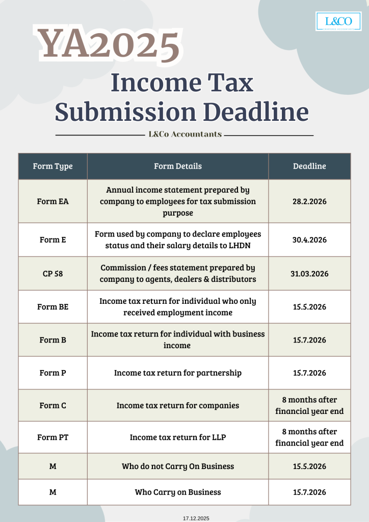 Below are the deadlines for YA 2025 (to be submitted in 2026) covering individual taxpayers, employers, and businesses. Please check the applicable deadlines based on [...]