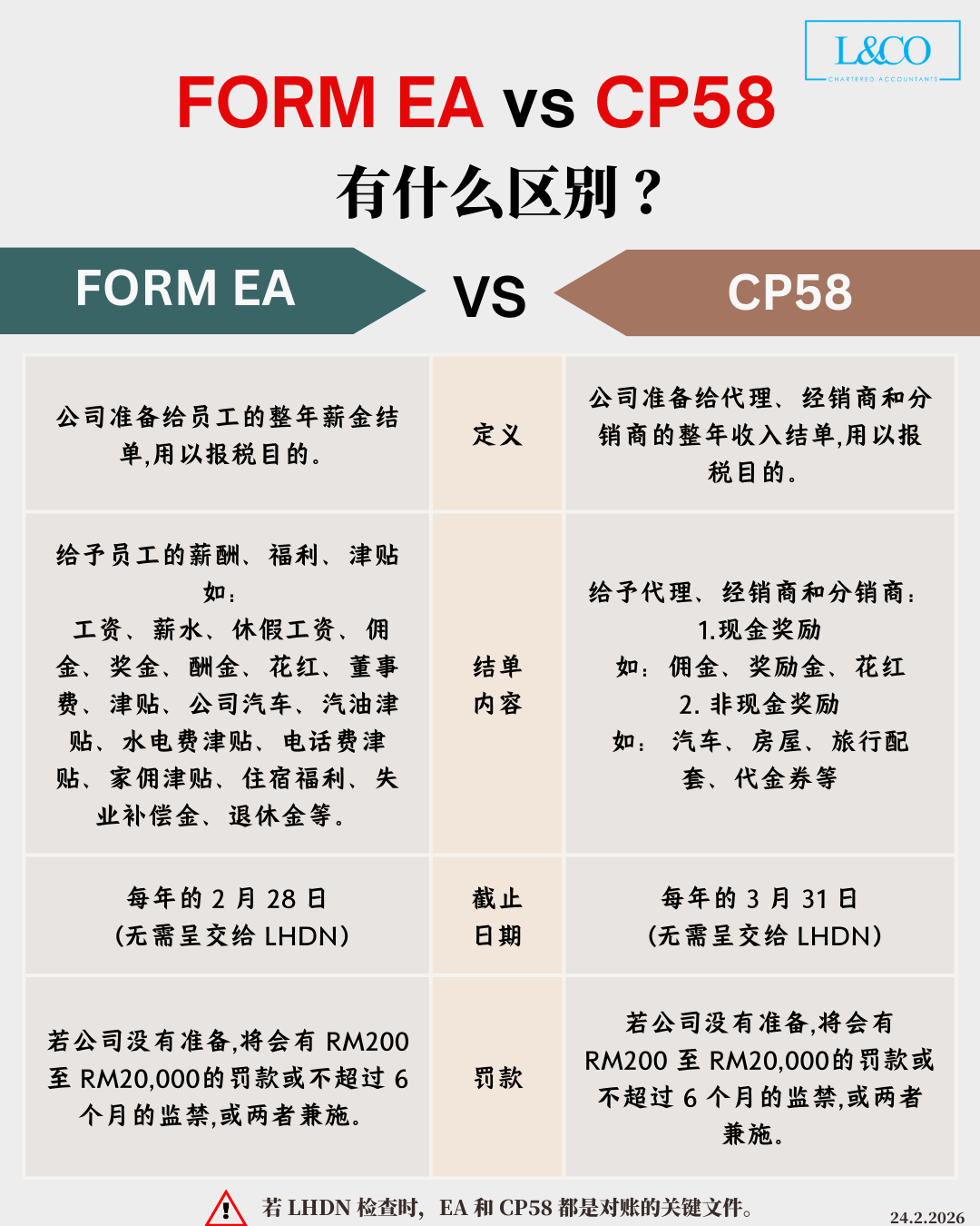 Form EA 及 Form CP58 均为企业每年必须准备的重要税务文件。随着截止日期临近,企业应确保相关文件已妥善准备,以避免不必要的罚则风险。 Form EA & CP58 有何区别? Form EA 为公司提供予员工的年度薪酬结单,用作员工个人所得税申报用途。 Form CP58 为公司提供予代理、经销商及分销商的年度收入结单,用于税务申报用途。 企业应按规定期限准备相关文件,以确保符合税务合规要求。未按时准备,可能面对罚款或其他法律责任。 **资料更新至24.2.2026