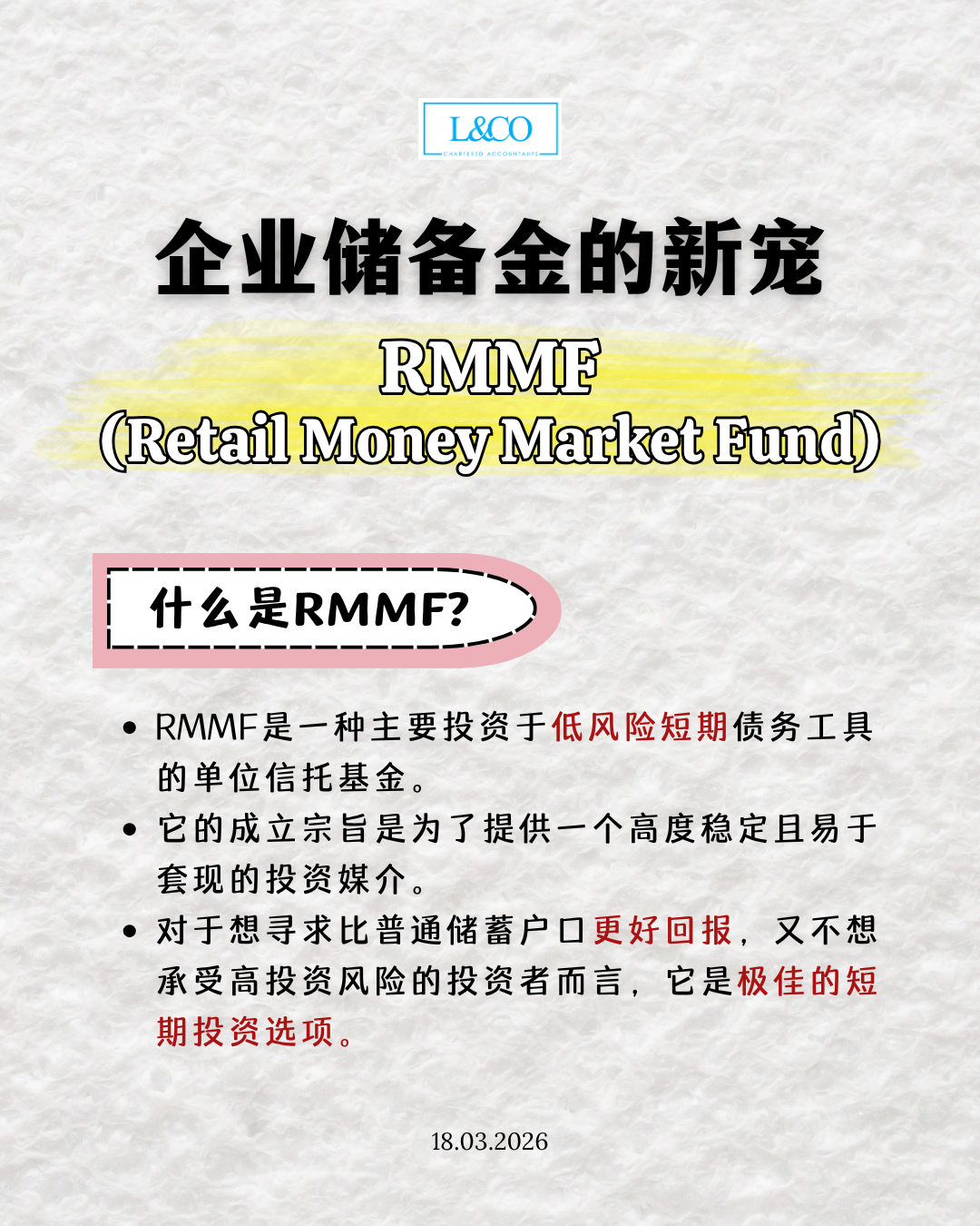 在通货膨胀和商业竞争的双重压力下,您公司的备用金还在普通的往来户口(Current Account)里睡大觉吗?还是被定期存款(FD)锁死了现金流? . 为您介绍越来越多企业选择的理财工具——零售货币市场基金(RMMF)!它是一种主要投资于低风险短期债务工具的单位信托基金 ,旨在提供一个高度稳定且易于套现的投资媒介。 什么是 RMMF? RMMF 是一种主要投资于低风险短期债务工具的单位信托基金。 它的成立宗旨是为了提供一个高度稳定且易于套现的投资媒介。 对于想寻求比普通储蓄户口更好回报,又不想承受高投资风险的投资者而言,它是极佳的短期投资选项。 为什么使用 RMMF?(三大核心好处) 收益更佳且每日计息:有别于普通往来账户的极低利息,RMMF 的回酬率不仅比普通储蓄账户更具吸引力,而且它是按日计息的,让闲置资金每一天都在帮公司创造价值。 高流动性,随时应对急需:不同于定期存款(FD)提早提出会被扣除利息,RMMF 允许您轻松将资产变现,随时应对突发的资金需求。 合法且完善的税务处理:通常情况下,从持牌银行和金融机构取得的利息都属于应纳税收入。而 RMMF 拥有一套非常透明且对企业友好的税务抵扣机制,不仅账目清晰,还能直接辅助公司报税。 对比表 特性 往来户口 (Current Account) [...]