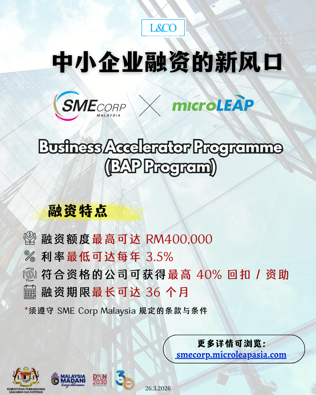 SME Corp Malaysia 推出的 Business Accelerator Programme (BAP) 现已重新开放申请, 旨在协助中小企业获取资金、加快扩张与提升竞争力。 计划亮点 融资额度最高可达 RM400,000 利率低至每年 3.5% 符合资格的公司可获得最高 40% 回扣 / 资助* 融资期限最长可达 36 个月 注意事项: 融资资金名额有限,申请将根据资金可用情况审批。 [...]