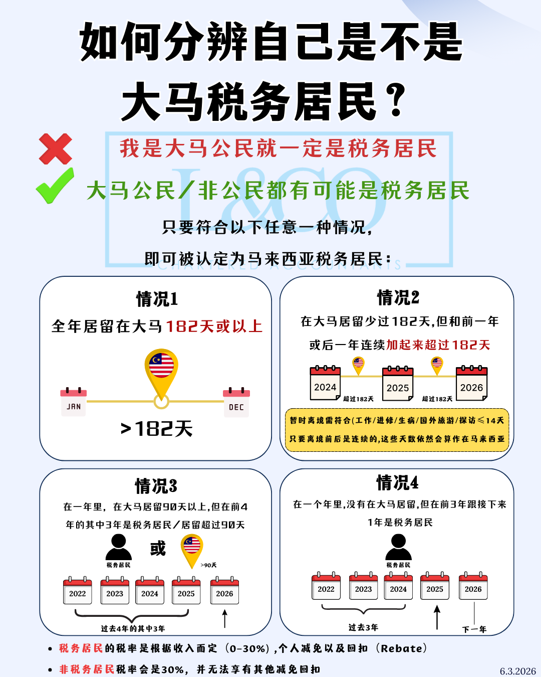 许多人误以为,只要是马来西亚公民,就一定属于税务居民(Tax Resident)。 事实上,这是一种常见的误解。 在马来西亚的税务制度下,税务居民身份需要根据个人在马来西亚的居留情况来判断。 这意味着: 马来西亚公民 不一定是税务居民 外国人 也可能成为马来西亚税务居民 只要符合以下 四种情况中的任何一种,即可被视为马来西亚税务居民。 1.在一年内居留 182 天或以上 若个人在该评税年度内,在马来西亚 累计居留182天或以上,即被视为税务居民。 2.居留少于182天,但与前后年度连续 若在某一年居留 少于182天,但该居留期 与前一年或后一年连续计算,总数超过182天,仍可被视为税务居民。 在此期间的暂时离境也可能被视为连续居留,例如: 工作原因 进修或学习 医疗原因 短期海外旅游 [...]