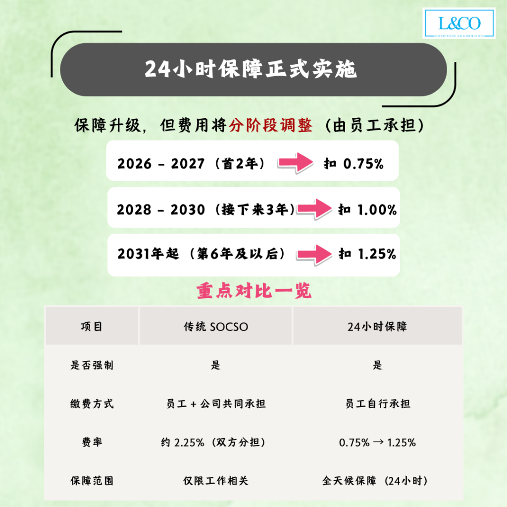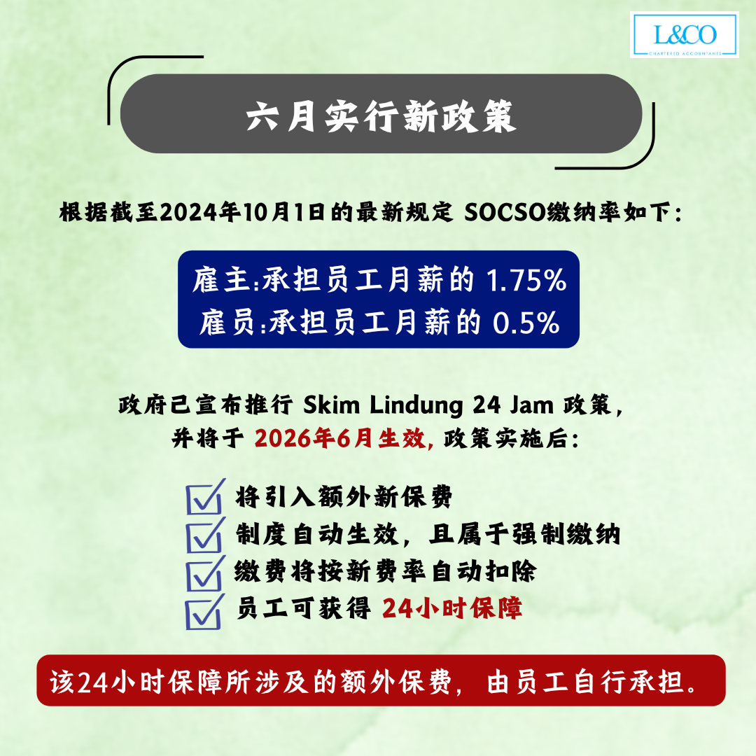 SOCSO 2026 新政策(PERKESO)将于2026年6月实施 Skim Lindung 24 Jam,扩大至全天候保障。Social Security Organisation将把保障从工作意外延伸到日常生活意外(如在家、出行、运动等),并提供持续收入支持,包括每月现金赔偿、医疗及康复补助。整体制度属于长期风险保障,而非一次性赔偿。