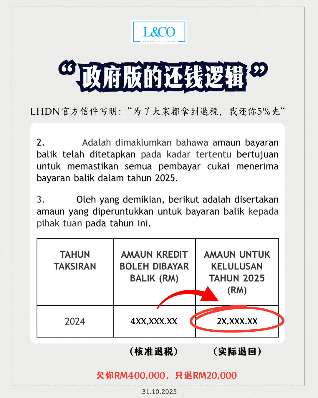 今天客户告诉我,他的 LHDN(马来西亚内陆税收局)退税核准金额是 RM400,000+。