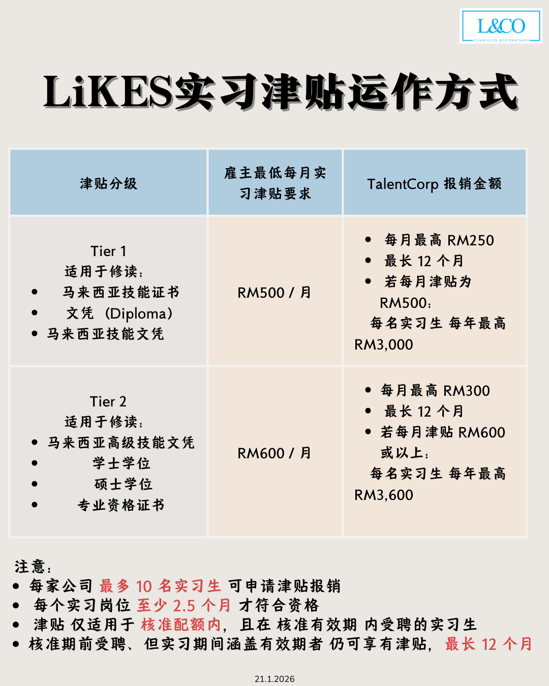 LiKES 的补贴金额将依据实习生的学历资格分为不同等级(Tier),