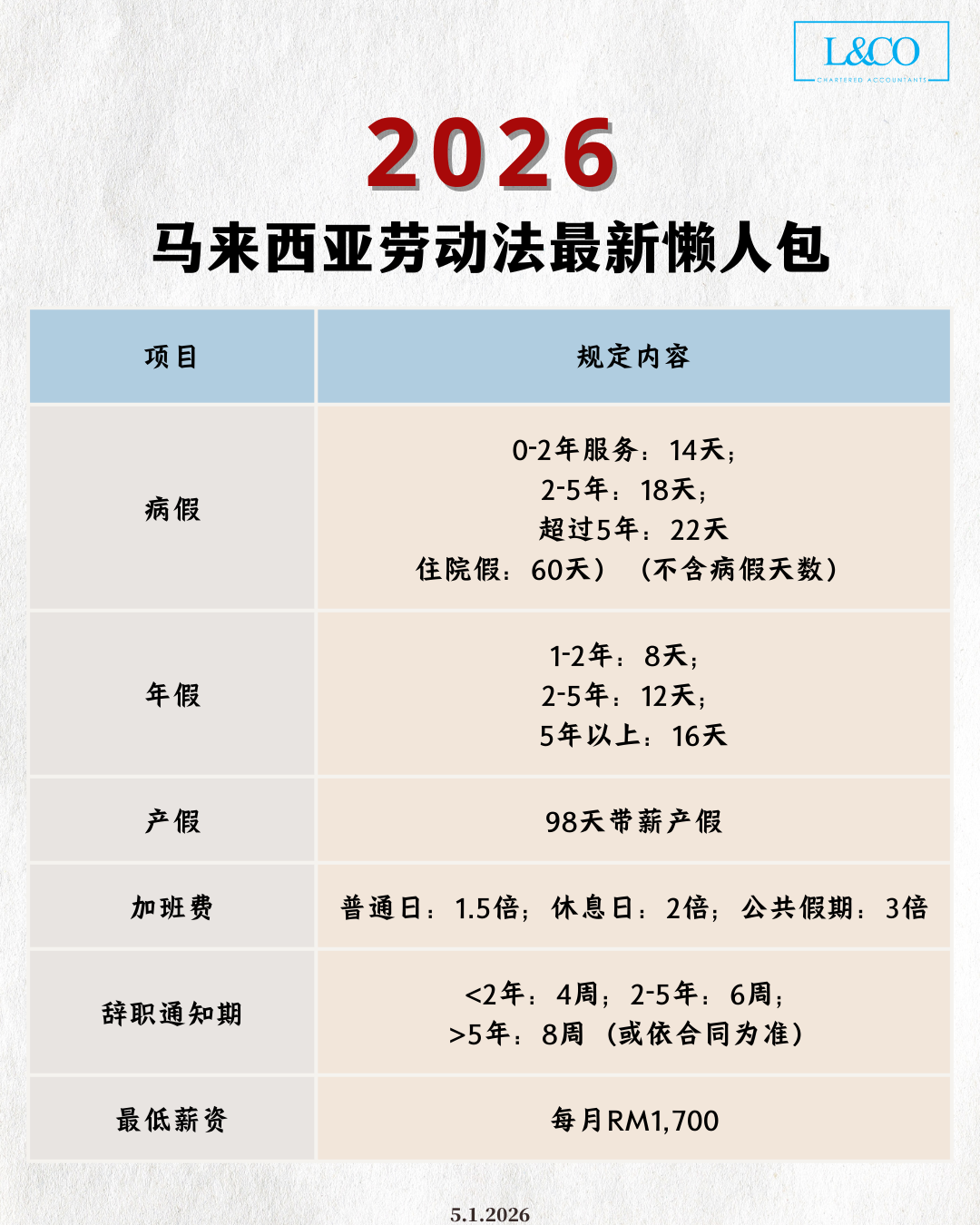 随着 2026 年的到来,马来西亚劳动法规持续优化,以保障员工基本权益,同时协助雇主合规营运。