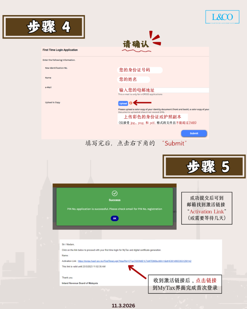 成功提交之后,LHDN会将激活链接 – “Activation Link”  发送至您的电邮。收到邮件后,点击激活链接到 MyTax 界面完成首次登录