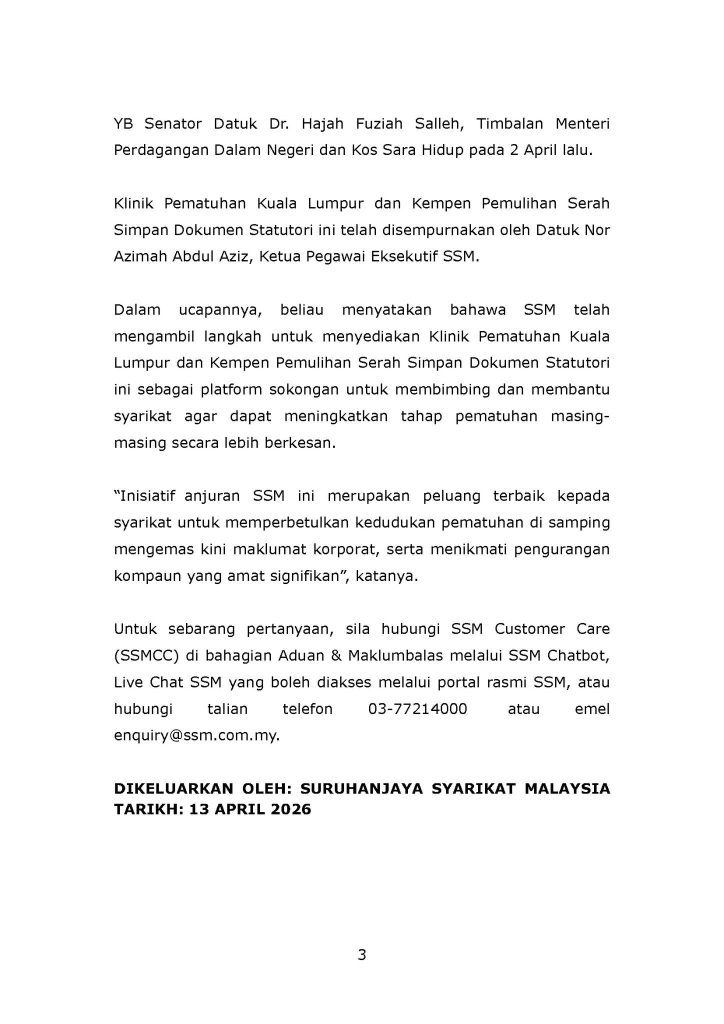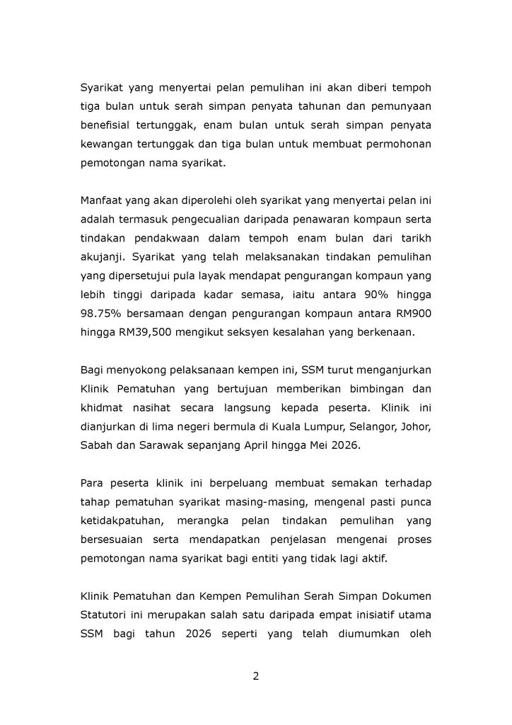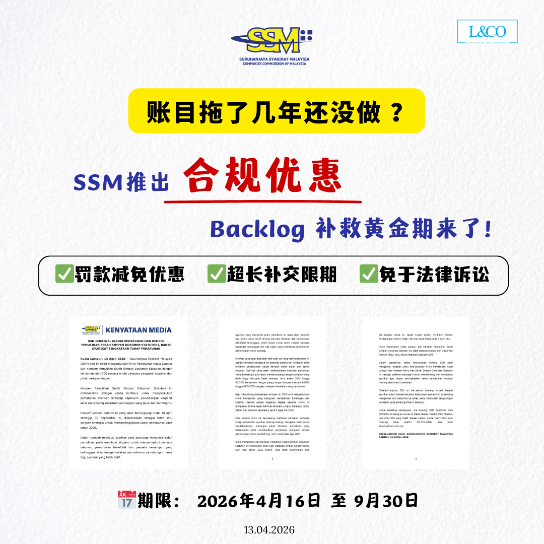 马来西亚公司委员会(SSM)已正式推出 “法定文件规范化运动”,为企业提供一个限时的合规缓冲期,让公司可以在较低成本与风险下恢复正常运营。