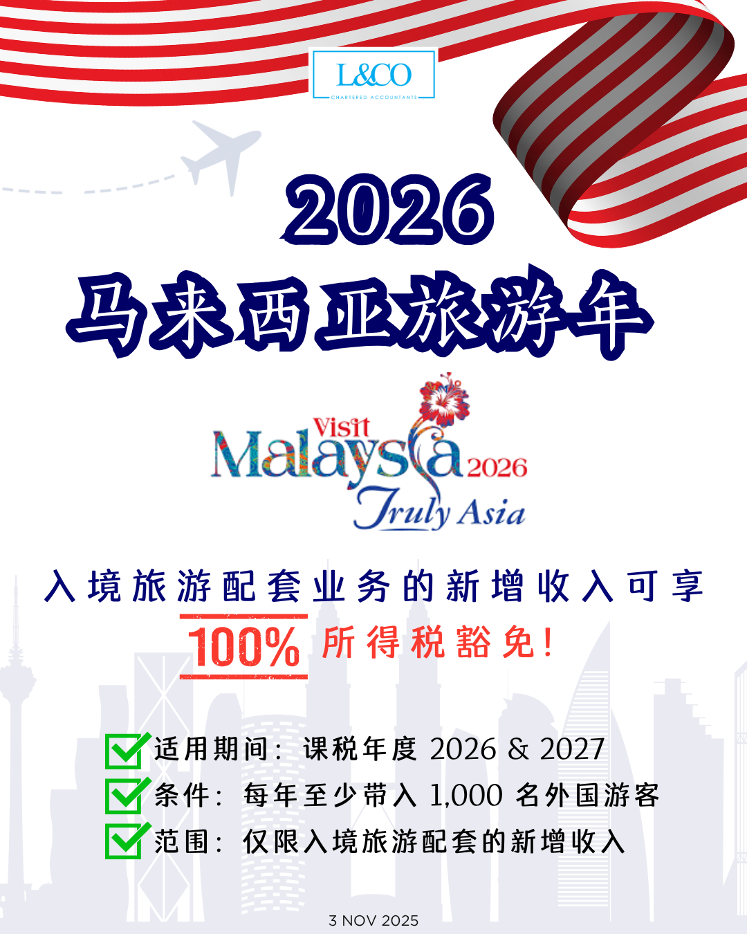 为配合 Visit Malaysia Year 2026,政府宣布延长并优化对旅游业者的税务奖励措施,以进一步推动入境旅游发展。