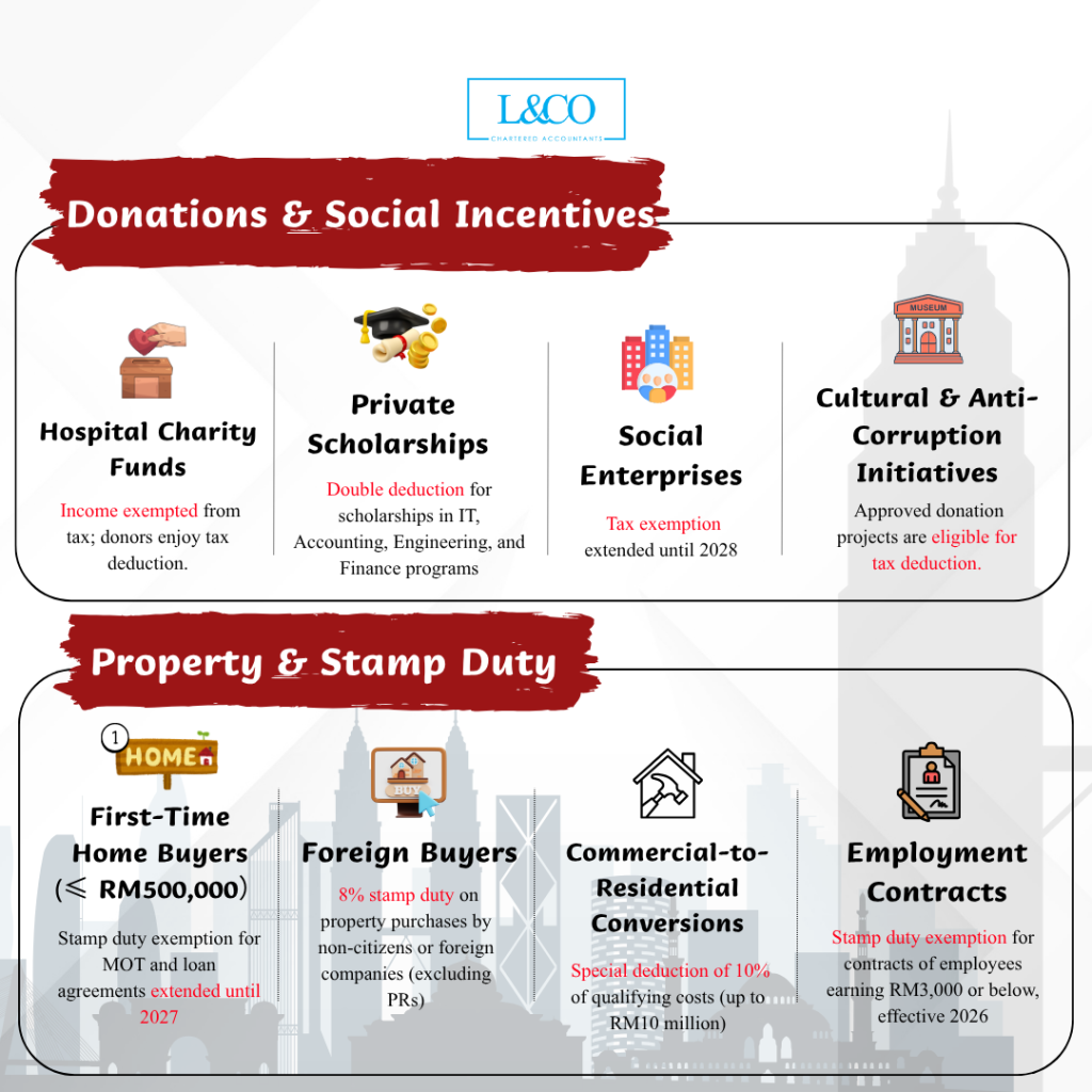 - Employment Contracts – Stamp duty exemption for employment contracts of employees earning RM3,000 and below, effective 1 Jan 2026.